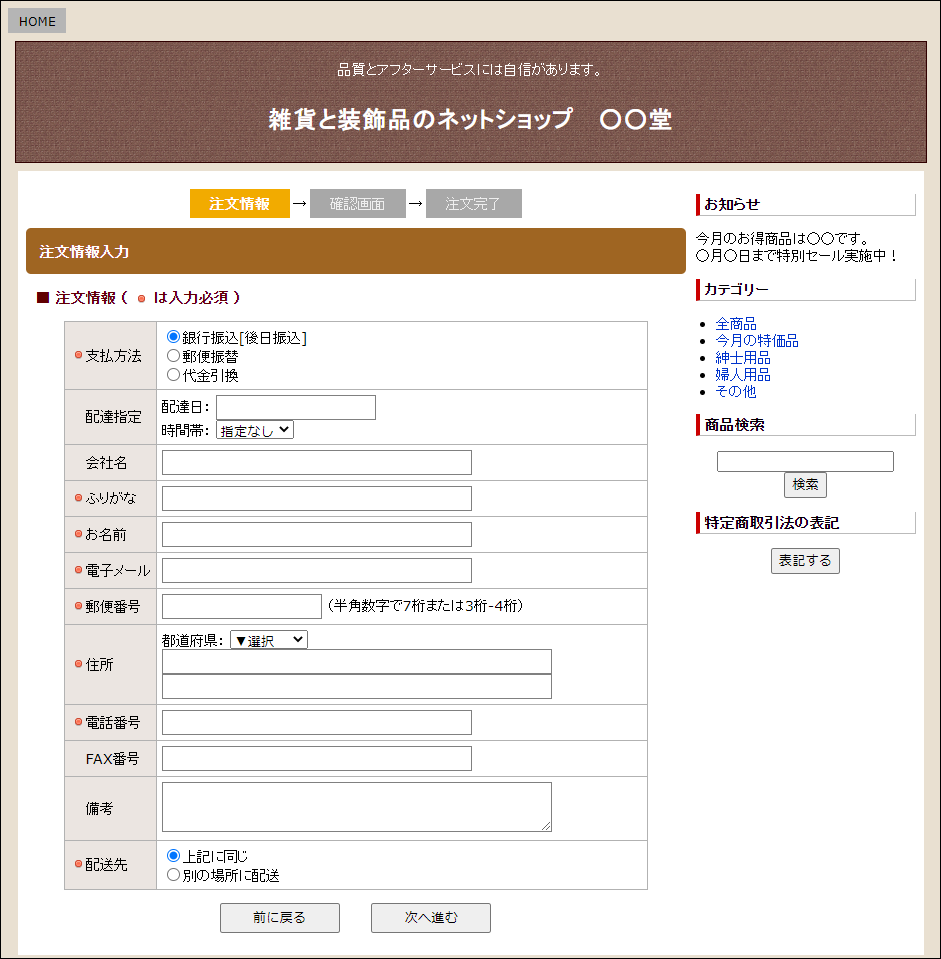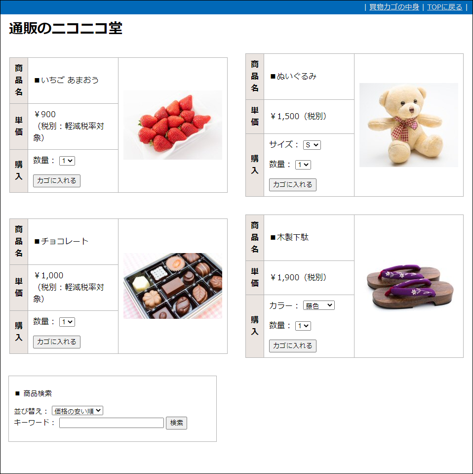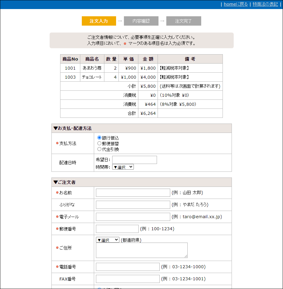 簡易型のショッピングカートで、買物を「入力→確認→送信」の3画面で完結します。