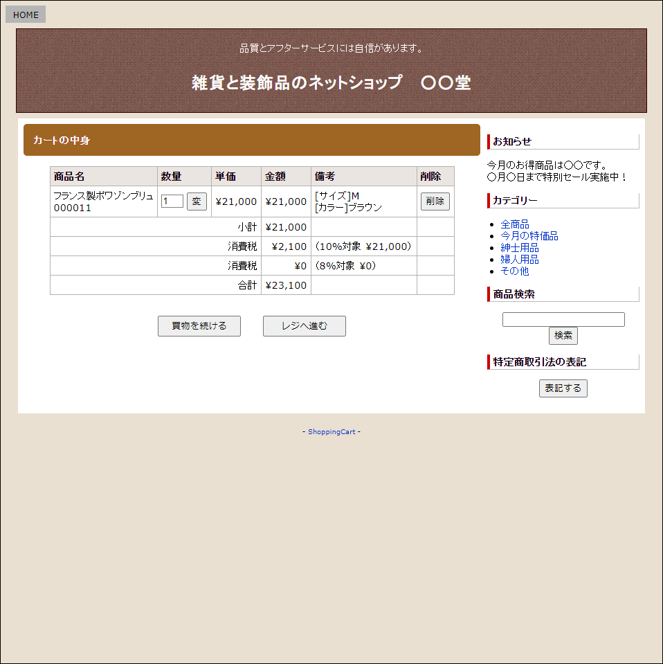 - 買物情報としてのクッキーは、セッション・クッキーを利用するため、利用後ブラウザを閉じると買物情報は自動消去されます。
